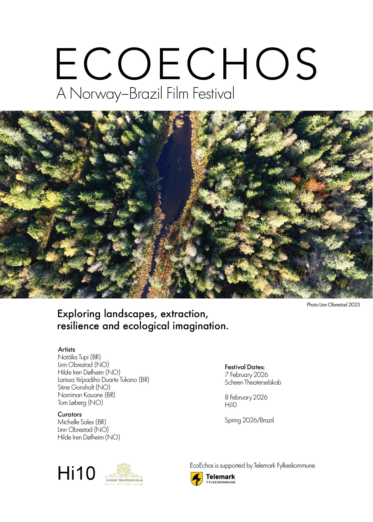 EcoEchos is a new film art festival initiated by artists and filmmakers Linn Obrestad and Hilde Iren Dølheim in collaboration with Stine Gonsholt and Tom Løberg. The festival’s first edition takes place in Skien, Norway, 7–8 February 2026, with a parallel screening in Brazil later in the spring.